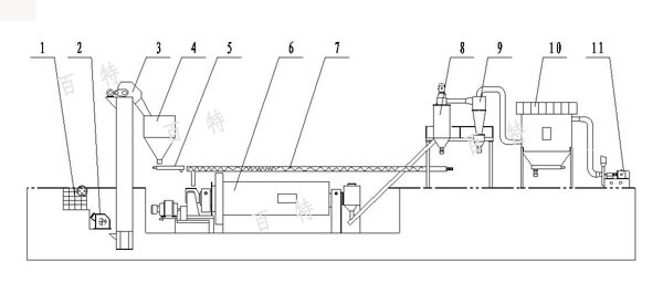 1、 鄂破機(jī) 2、錘破機(jī) 3、斗提機(jī) 4、 緩沖料倉(cāng) 5、給料機(jī) 6、球磨機(jī) 7、粗料返回 8、分級(jí)機(jī) 9、旋風(fēng)收集器 10、脈沖除塵器 11、引風(fēng)機(jī)